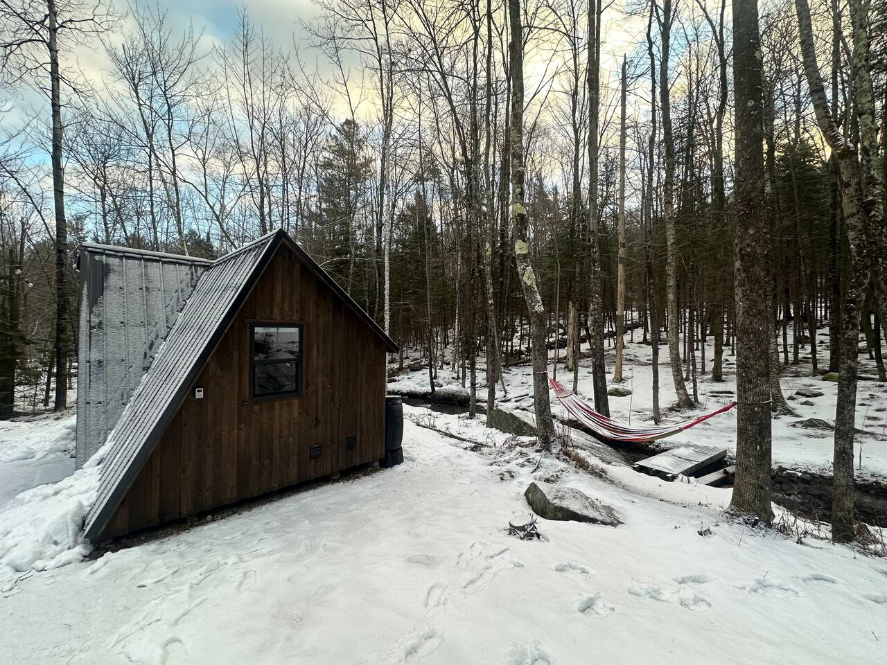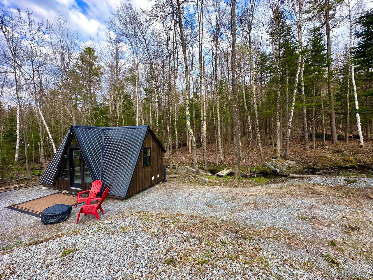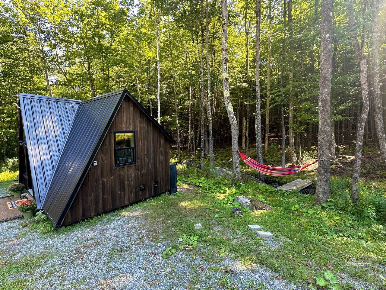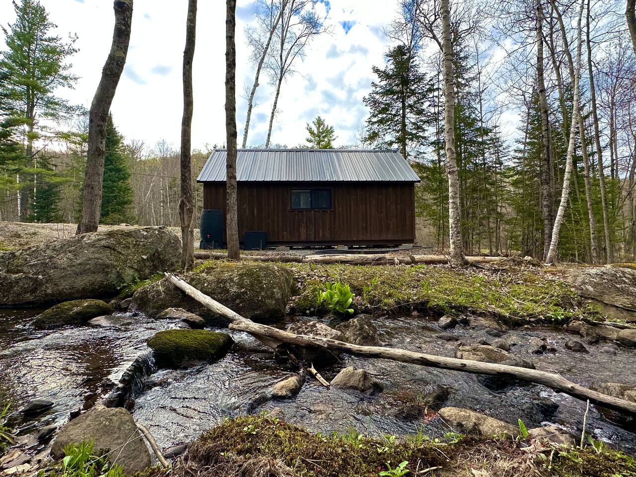 Welcome to Kim's Kamp at the Adirondacks! The ultimate off-grid GLAMPING experience! This Little Black A-frame is a brand new construction. It features a Brook, picturesque window , indoor half bathroom, kitchenette, TV & Wi-Fi . This is an off-grid cabin with NO running water. We are located only 28 min. to Lake George, 20 min. to Gore Mountain, Revolution Rail, waterfall & trails. There is another cabin on the same lot if you want to rent both. It's called "Little Red Cabin by the Brook".