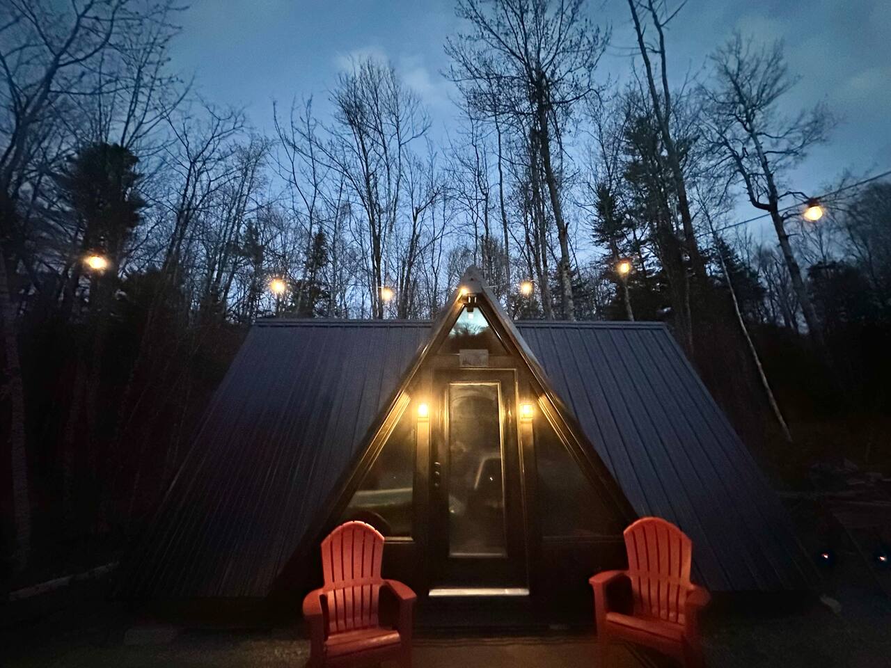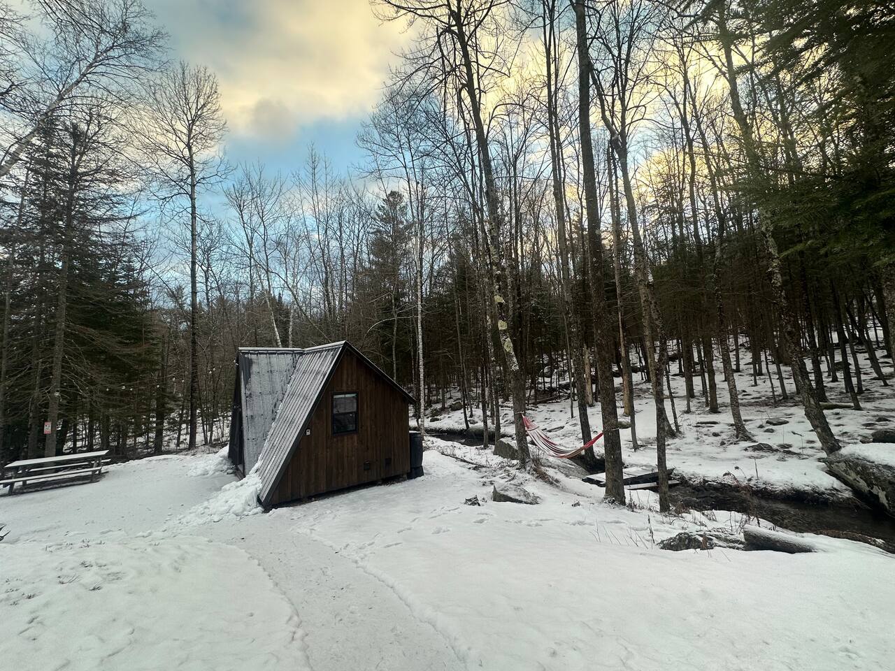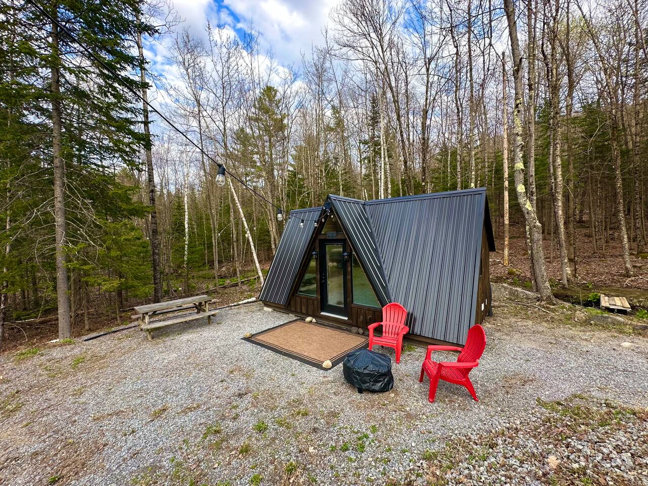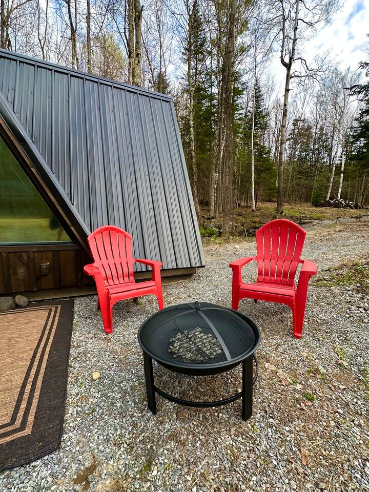 Welcome to Kim's Kamp at the Adirondacks! The ultimate off-grid GLAMPING experience! This Little Black A-frame is a brand new construction. It features a Brook, picturesque window , indoor half bathroom, kitchenette, TV & Wi-Fi . This is an off-grid cabin with NO running water. We are located only 28 min. to Lake George, 20 min. to Gore Mountain, Revolution Rail, waterfall & trails. There is another cabin on the same lot if you want to rent both. It's called "Little Red Cabin by the Brook".
