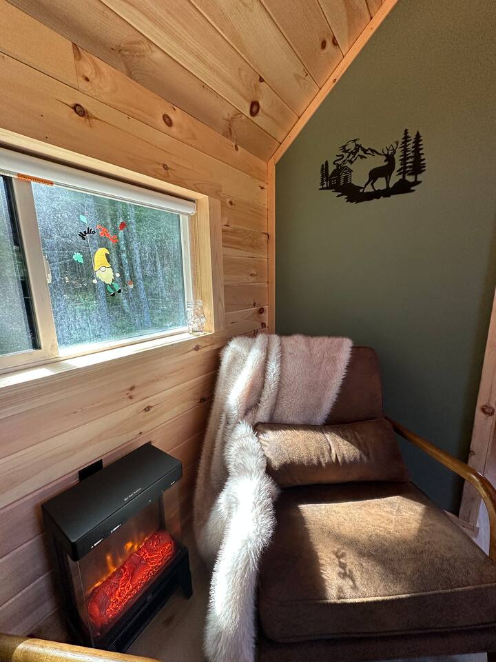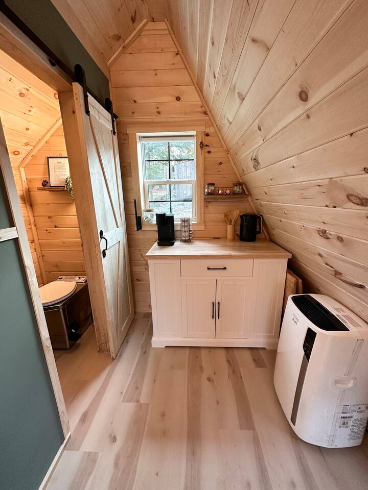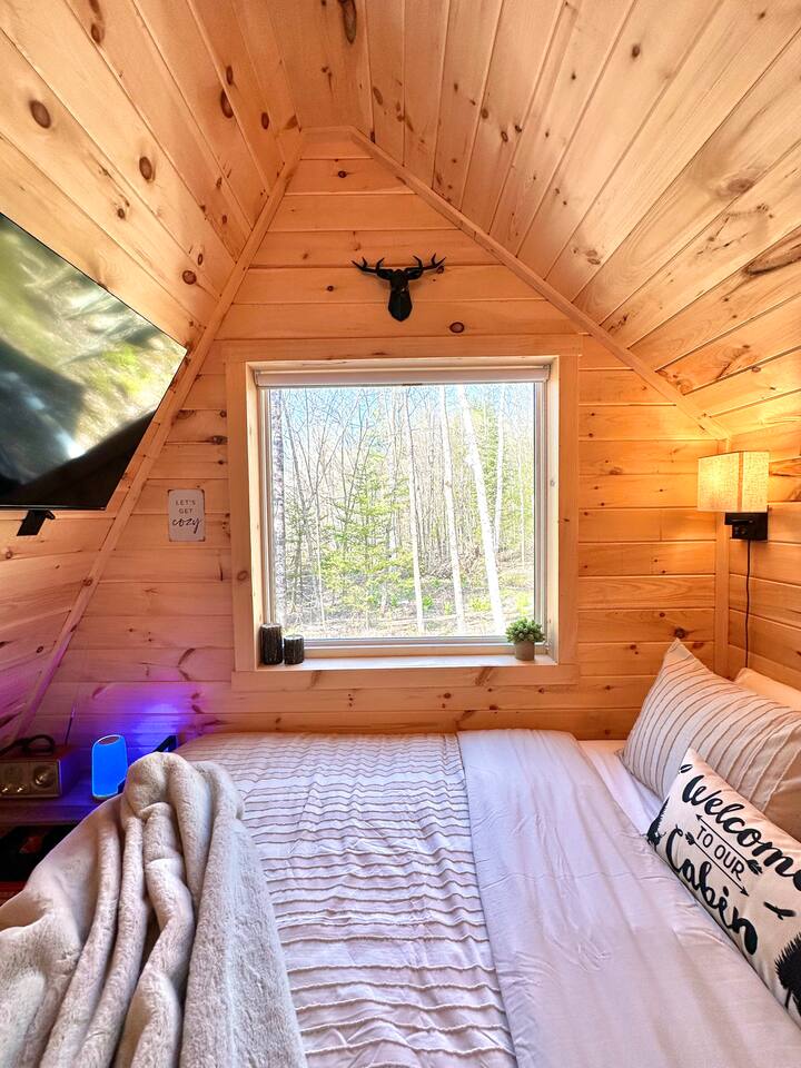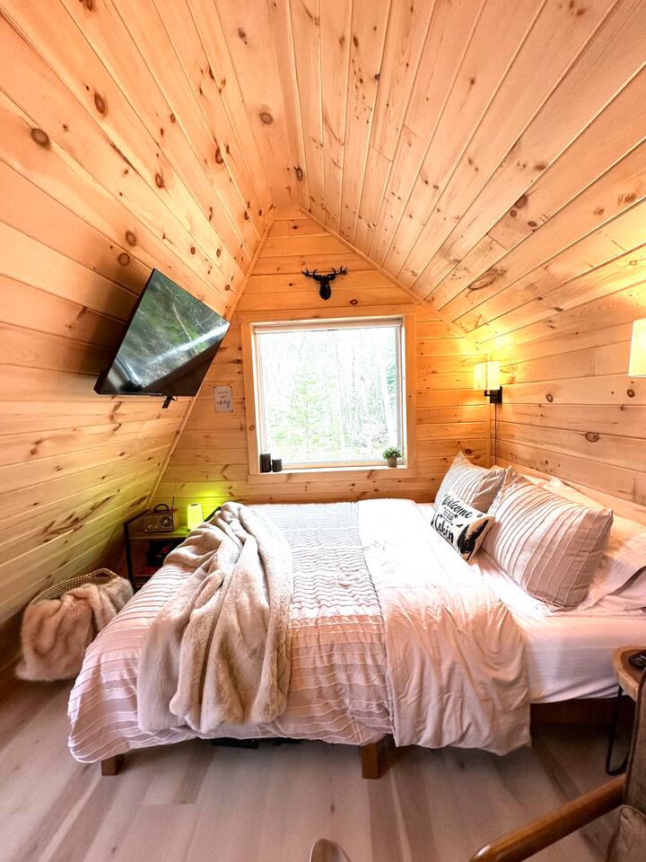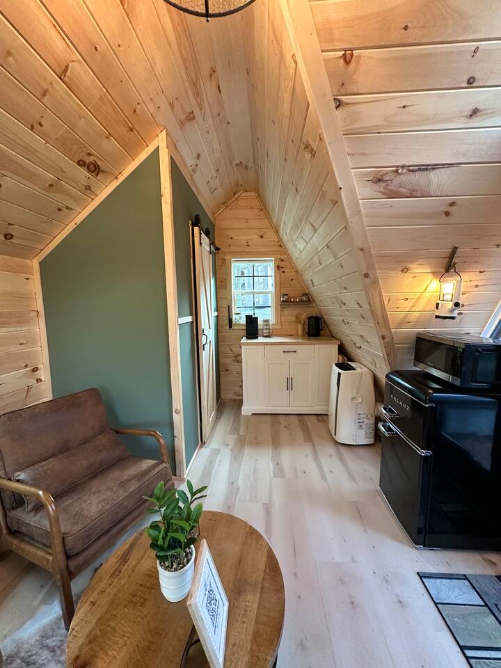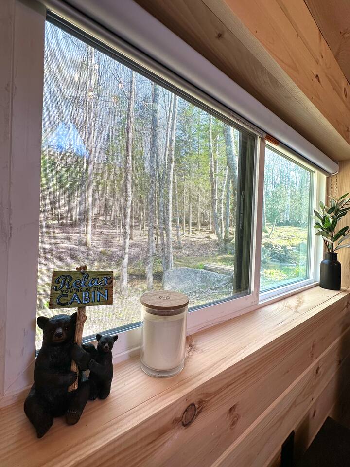 **BEFORE BOOKING PLEASE READ THE “OTHER THINGS TO NOTE” SECTION. It has details you NEED TO KNOW before booking.** **2 CABINS ON THE SAME PROPERTY. MUST RESPECT THE NEIGHBORS/GUESTS IN THE RED CABIN. YOU MAY RENT BOTH CABINS FOR MORE PRIVACY OR WITH OTHER FRIENDS AT A DISCOUNTED RATE. OTHER CABIN CAN SLEEP UP TO 4 PEOPLE. BOTH CABINS ARE NOT ALWAYS RENTED AT THE SAME TIME. PLEASE INQUIRE. ** We provide everything you need for a comfortable stay at an off-grid cabin including electricity and a natural brook for your water source. This 240 sq ft. cabin sleeps up to 2 people comfortably. The A-frame cabin is surrounded by pine wood and natural lighting. It has a beautiful brook running through the property all year-round. Perfect to sit next to the brook sipping your coffee or glass of wine while hearing the sound of the water and trees. The location is breathtaking and great to disconnect from the outside world. ITEMS PROVIDED/FEATURED: - Queen bed- sleeps 2 - Linens, comforters and pillows - Toilet paper - Incinerator toiler (inside) - Hand sanitizer, hand soap & dish soap - 2 bath towels / hand towel - WIFI - Smart TV - Bluetooth Radio - Boardgames/ cards / Adult coloring book - Coleman tabletop grill/ Grill utensils - Fire pit (firewood not included) - First-aid kit - Ambient colorful lamp - Rechargeable Lantern - Kitchenette: salt & pepper, refrigerator, microwave, toaster, electric kettle, electric griddle, plates, bowls, utensils, cooking utensils, cups, wine glasses, can opener, wine opener, scissor, roasting sticks (for s’mores), misc. - Natural brook for water source - Immersion bucket water heater - Bucket Is there heat or AC? AC unit and ceiling fan for cooling. Heating unit and electric fireplace for heat. Is there a bathroom? Half bathroom with an incinerator toilet and exhaust vent inside the cabin. Hand sanitizer for cleaning hands. Is there electricity? Yes! We provide 100amp electricity. Don't worry you will have WIFI, lots of light, a smart tv and cooking essential. We provide a rechargeable lantern for hanging out by the fire pit or walks. Is there firewood? We don’t provide log wood for the fire pit, but if you want to bring an axe you can use all the tree bark that’s stacked up. If you don’t want to chop logs, then you can buy some packs from the nearest market. LITTLE RED CABIN (other listing on property) https://www.airbnb.com/slink/DE2v6is3