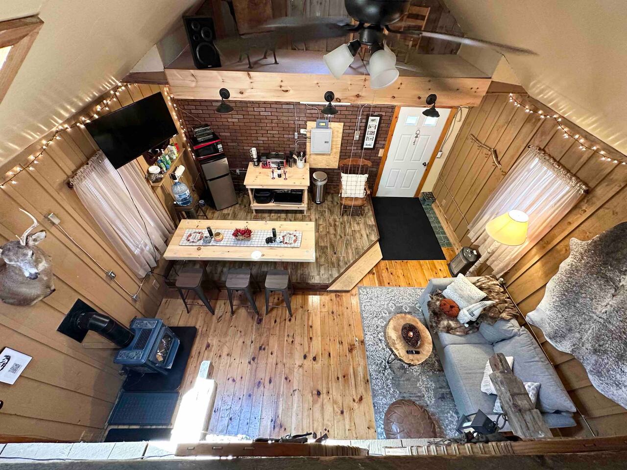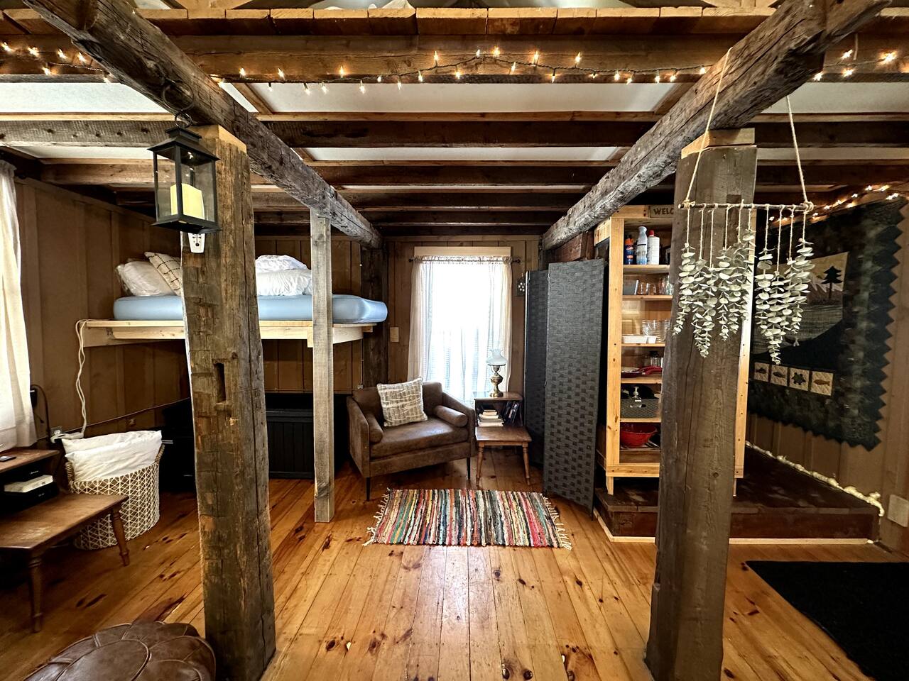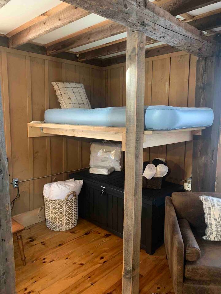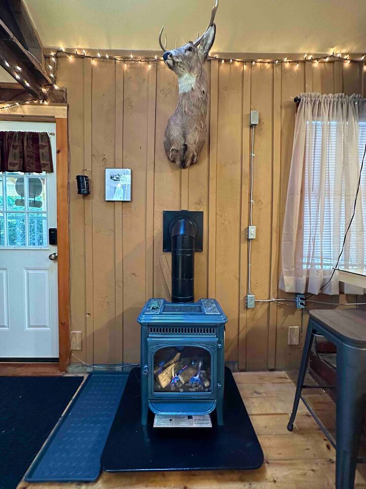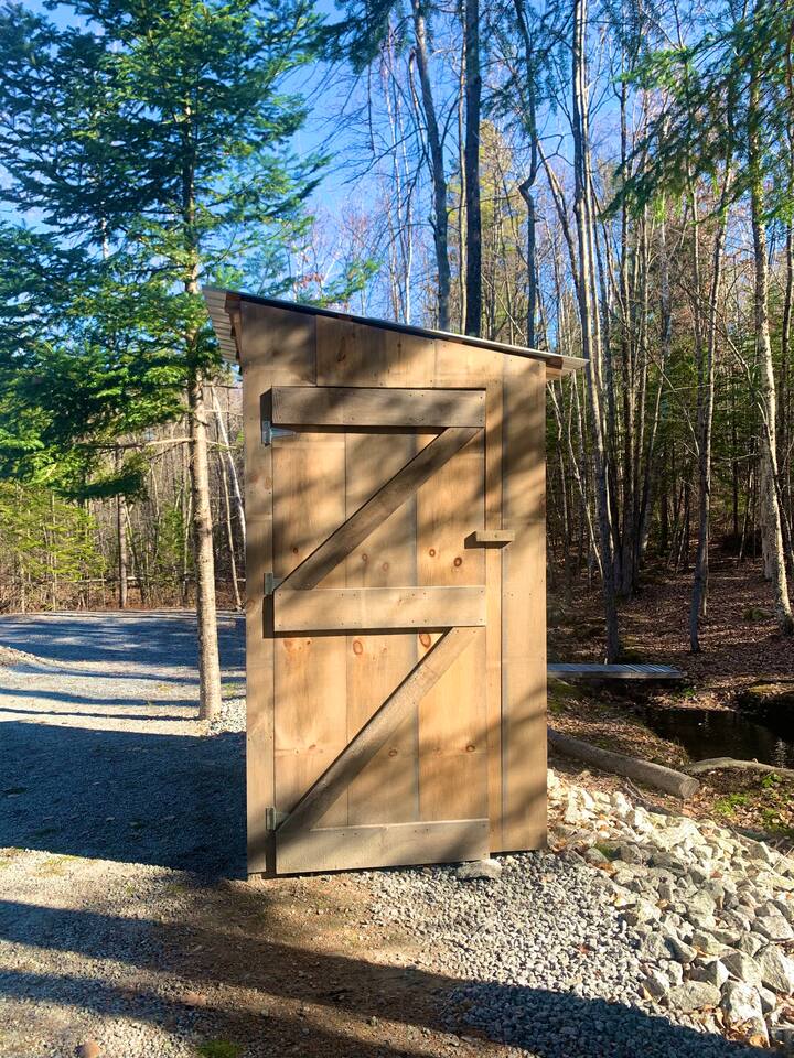 **BEFORE BOOKING PLEASE READ THE “OTHER THINGS TO NOTE” SECTION. It has details you NEED TO KNOW** **2ND A-FRAME CABIN ON SAME PROPERTY AVAILABLE TO BOOK TOGETHER FOR A CHEAPER RATE- SLEEPS 2 (LITTLE BLACK A-FRAME)** Both have their own privacy and it’s still considered remote. please inquire! We provide everything you need for a comfortable stay at an off-grid cabin. This 420 sq ft. cabin sleeps up to 4 people comfortably. The driveway can fit up to 2 cars. The little cabin has a beautiful brook running through the property all year-round. This is where you will get your water source from. Perfect to sit on the deck sipping your coffee or glass of wine while hearing the sound of the water and trees. The location is breathtaking and great to disconnect from the outside world. To add on to your romantic experience, at night you can walk over the little mini bridge over to the fire pit surrounded by the ambient lighting and just unwind. There is also a hidden waterfall only 5 minutes away! SLEEPING ARRANGEMENTS: Sleeper Sofa (main floor)- full size pull out bed- sleeps 2 Queen Bed- (loft area)- sleeps 2 Twin Size Air Mattress (main floor)- sleeps 1 (Linens, Comforters and Pillow not included) ITEMS PROVIDED/FEATURED: - Linens, comforters and pillows - Outhouse- Toilet paper and Incinerator toilet - Hand Sanitizer - 2 bath towels / hand towel - WIFI - Smart TV (FREE NETFLIX) - Radio - Boardgames/ cards - Grill & Grill utensils (propane included) - Fire pit (firewood not included) - First-aid kit - Rechargeable Lantern - Salt & Pepper - Kitchenette: refrigerator, microwave, toaster, electric kettle, electric cook top, pots/pans, plates, bowls, utensils, cooking utensils, cups, wine glasses, can opener, wine opener, scissor, roasting sticks (for s’mores), misc. - Natural brook for water source - Immersion bucket water heater - Bucket Is there heat or AC? We have a gas burning fireplace for keeping you warm on those chilly nights. We just installed a brand new powerful 10,000 BTU LG AC unit that cools the entire cabin. There is also a ceiling fan and extra portable fan for your convenience. Is there hot water? You may use the water from the brook, bucket and immersion water heater. Electric water kettle provided for hot water. Is there a bathroom? There is a HEATED outhouse so you don’t have to freeze in the winter season. In there you will find an INCINERATOR TOILET (odor free and completely sanitary). Instructions are in outhouse. You can clean your hands with the hand sanitizer. Is there electricity? Yes! We provide 200amp electricity. Don't worry you will have lots of light, charge your phone, watch tv or even cook inside. We provide 2 rechargeable lanterns for night trips to the outhouse or hiking. Is there firewood? We don’t provide log wood for the fire pit, but if you want to bring an axe you can use all the tree bark that’s stacked up. If you don’t want to chop logs, then you can buy some packs from the nearest market. 1 Dog is allowed during your stay for an additional $50 fee (with approval). Must add pet fee in booking inquiry. They MUST BE TRAINED and HOUSE BROKEN. We ask that dogs DO NOT get on the beds or couch out of respect for other people's allergies. Bring a dog blanket/ bed for your pet to stay off the carpet/rugs. Dog must be on a leash at all times. There is another cabin on the property and is also dog friendly. LITTLE BLACK A-FRAME (other listing on property) https://www.airbnb.com/slink/DRgNaUIx
